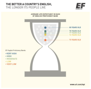 Заняття з англійської мови важко недооцінити. Те, наскільки добре громадяни країни(неангломовної) володіють англійською, взаємопов’язано з величиною заробітку, впровадженням інновацій та тривалістю життя. Про це йдеться у дослідженні одного з найкрупніших ресурсів з вивчення іноземних мов – Education First. Зрозуміло, що зв’язок є опосередкованим – через якість життя, достаток, прагнення відповідати новим трендам (наприклад, провадити здоровий спосіб життя) та рівень медичного обслуговування в країні. Але все ж ця статистика знову підтверджує, що вільне володіння англійською мовою є необхідне для людини, яка прагне належати до найкращої частини світу.